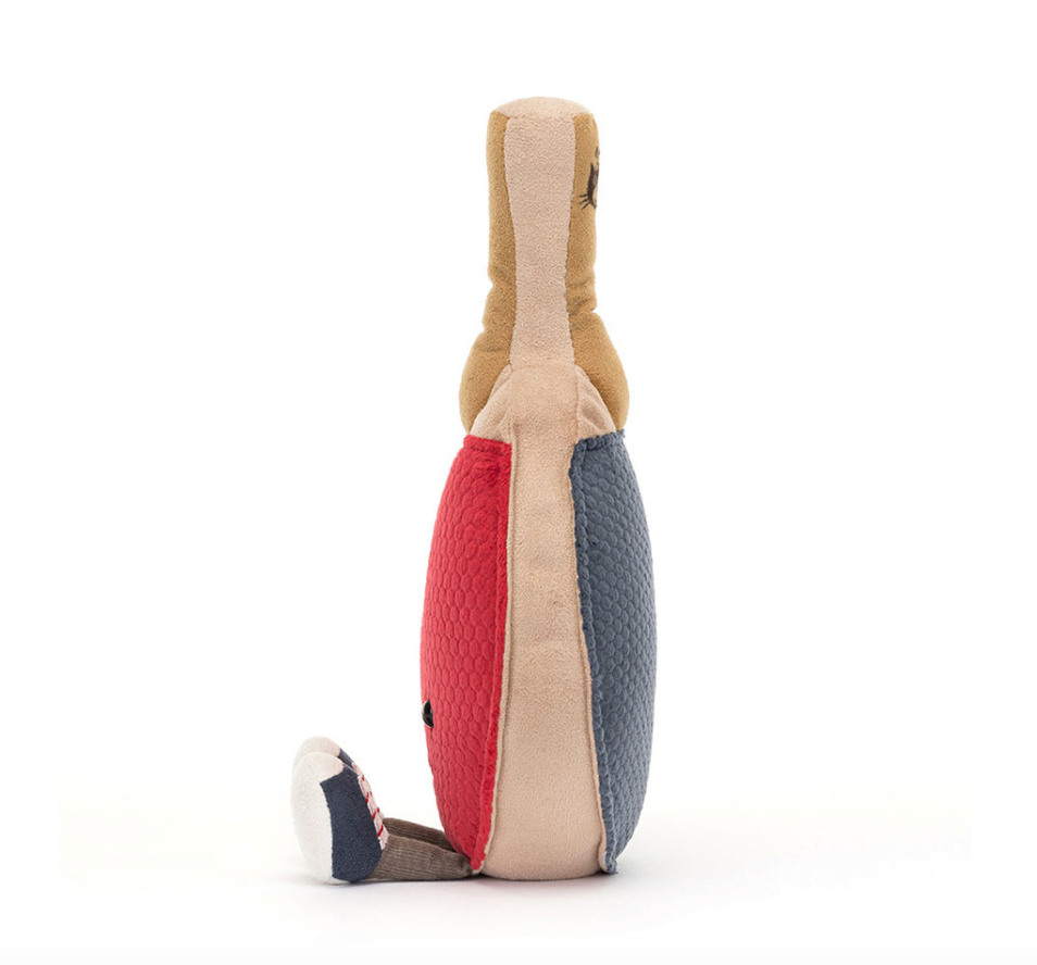 Amuseables Sports Table Tennis is gorgeously textured and ping-ponging with color! From that caramel-nougat suedette handle to those textured panels in red and blue – and you can’t miss those cream-and-navy trainers, embroidered in vibrant red. To you!