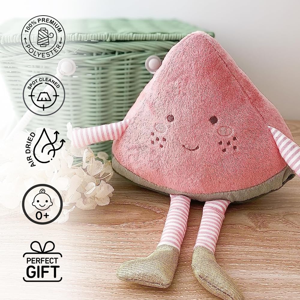 Water Melonie plush toy is a friendly fruit with a whimsical and adorable face. A delightful pal or room decor!